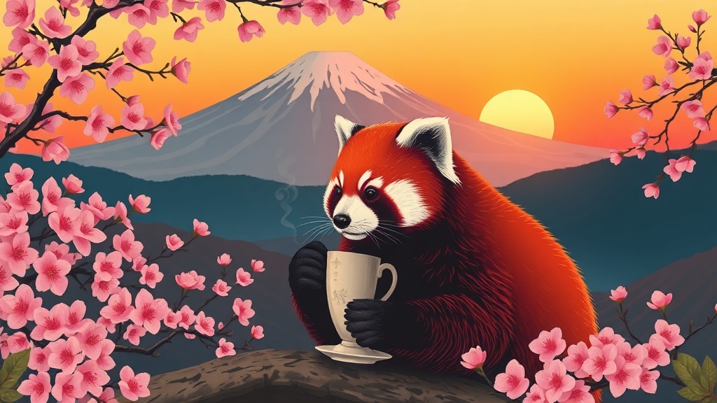 Start Now.A red panda sipping tea under cherry blossoms at sunset with Mount Fuji in the background, in the style of art nouveau