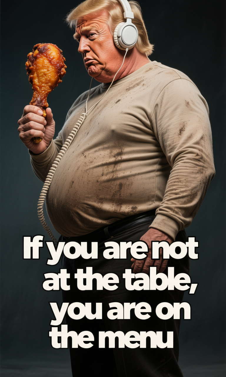 A hyper-realistic, cinematic side-profile portrait of Donald Trump depicted with an exaggerated, heavy physique, wearing a tight, filth-stained beige long-sleeve shirt and black pants. He is wearing white retro over-ear headphones with a wire and holding a large, crispy fried chicken drumstick in his right hand. The lighting is dramatic studio lighting with deep shadows and a dark grey background, creating a moody atmosphere. The image includes the text citation overlay: "If you are not at the table, you are on the menu" in a bold, dramatic font. 8k resolution, highly detailed texture, satirical realism.