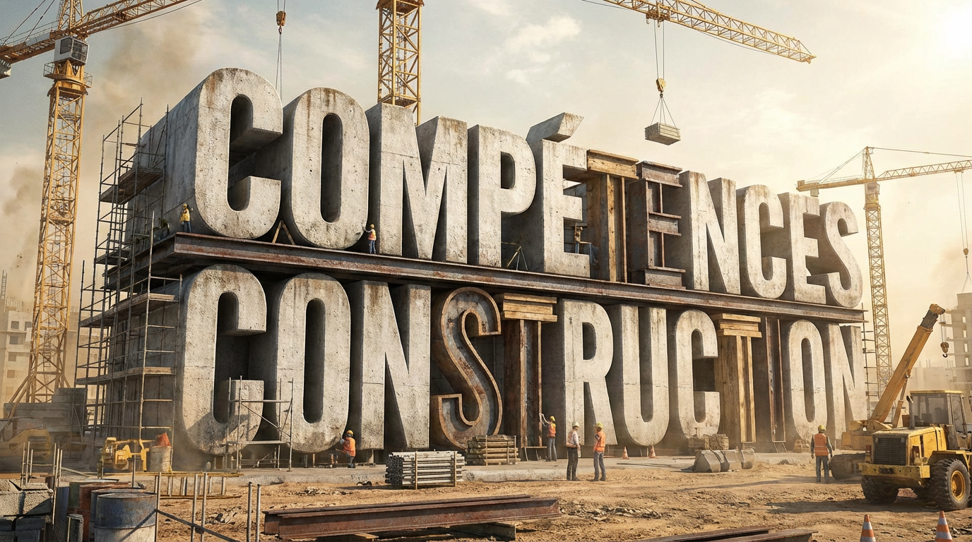 LOGO COMPÉTENCES CONSTRUCTION en lettrage en 3 dimensions géant sur un chantier de construction